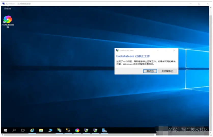 最后附上登录的桌面的截图,登上来就是一个backstab的报错,这刚好就解释了之前在干火绒的时候,为什么没有kill成功(因为程序兼容性问题导致崩溃了)。
