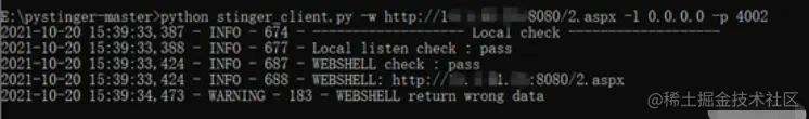 - 第二点:网上的例子大多数都用pystinger反代cs服务端来处理这种不出网上线cs的情况,但是可能因为目标网络环境的不一样导致各种玄学报错,所以Pystinger的局限性还是很大的,而且Pystinger客户端还不免杀。