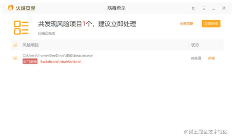 上面有提到过目标上有火绒和WD两款杀毒,直接上传正向shell肯定是会被秒杀的,本地测试报毒。