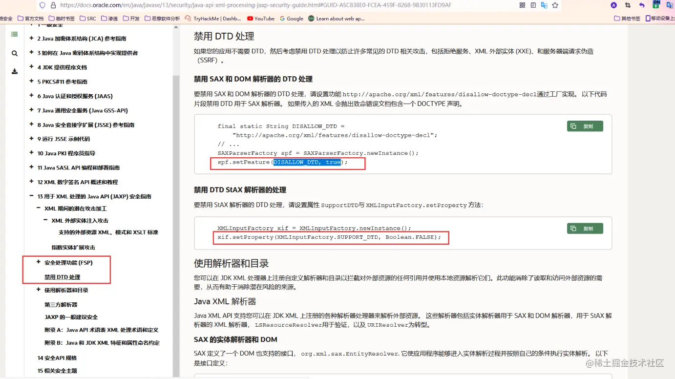 禁用 DTD 处理和配置解析器行为的机制因使用的 XML 解析器而异。