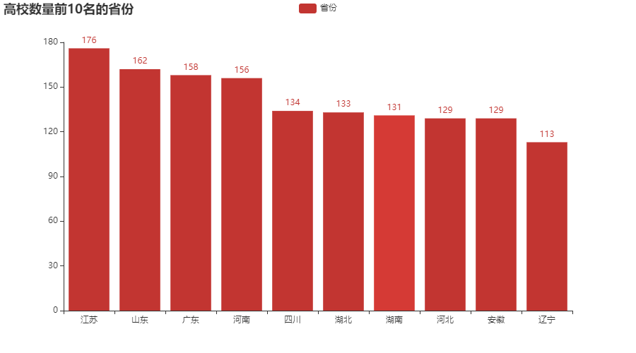 通过数据分析,江苏、山东、广东三省的高校数量最多。从近现代的教育的开端说起,清末洋务运动代表人物张之洞1902年创办了三江师范学院。国民时期定都南京,于1928年改名为国立中央大学。因此江苏高校数量的龙头是毋庸置疑的。综上所述,每个省份高校数量和该省的经济能力是密不可分的,表现为人数越少的省份,高校少而精;人数越多的省份,高校多而差,