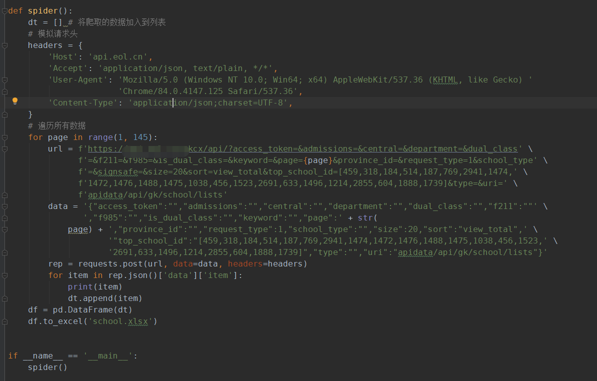 通过上一步的简单分析,可以看到api接口返回的信息,当前数据库共记录了2865条数据。通过分析接口和查看页面数据,发现每页的api只是页数不同,因此我们通过构造每页的api,利用requests库进行模拟请求,具体代码逻辑如下。