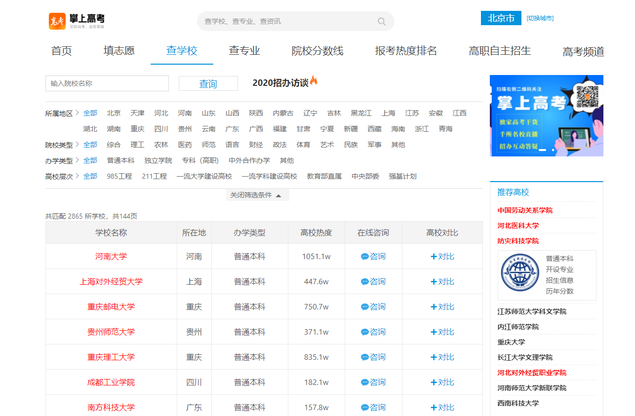 今天给大家讲解中国教育在线高校数据爬虫,我们从网站中爬取各大高校的基本信息,通过本案例大家可以直观的了解中国人民关注最多的学校、教育部重点扶持的省份、教育资源分布情况。截至2021年1月份,共计教育部认可在册高校2865所(含民办院校,不含台湾)。