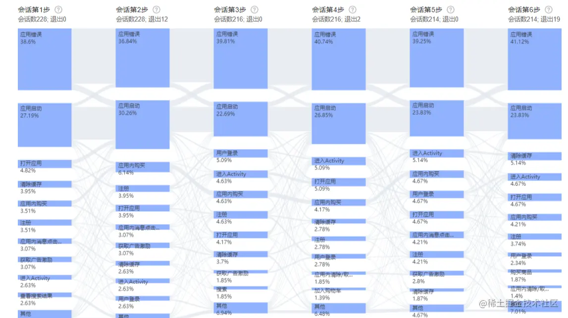 对开发而言,这样的埋点工作量十分繁杂;对产品和运营而言,大量的事件堆叠形成的路径桑基图盘根错节,可读性差,无法快速定位用户异常流失节点。由宏观到微观,从整体到局部,可帮助我们快速找到问题根因。页面路径分析通过清晰简化的页面流转桑基图,从宏观层面,帮助我们快速定位异常流失问题。
