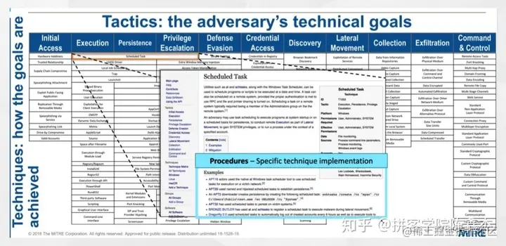 ATT&CK 框架是基于真实网络空间攻防案例及数据,采用军事战争中的 **TTPs (Tactics, Techniques & Procedures)**方法论,重新编排的网络安全知识体系,目的是建立一套网络安全的通用语言。