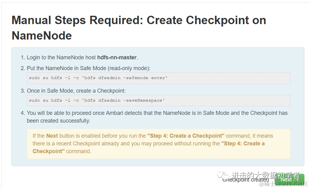sudo su hdfs -l -c 'hdfs dfsadmin -saveNamespace'