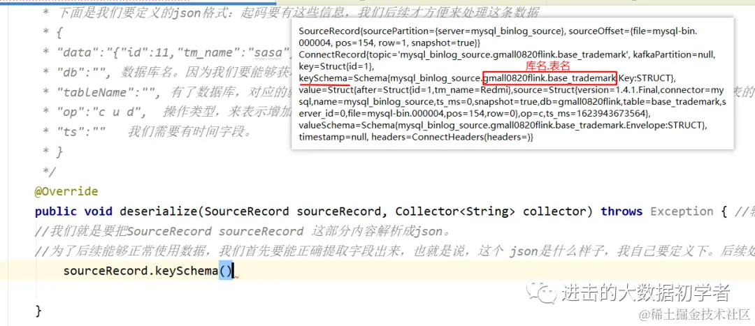 public void deserialize(SourceRecord sourceRecord, Collector<String> collector) throws Exception { //输入的数据 输出的数据