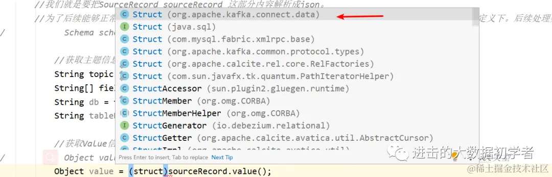 // Object value = sourceRecord.value(); 可以看见是object类型,但根据初始化获得的数据,是stuct类型