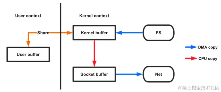 应用程序调用mmap(),磁盘上的数据会通过DMA被拷贝到内核缓冲区,接着操作系统会把这段内核缓冲区与应用程序共享,这样就不需要把内核缓冲区的内容往用户空间拷贝。应用程序再调用write(),操作系统直接将内核缓冲区的内容拷贝到socket缓冲区中,最后再把数据发到网卡去。