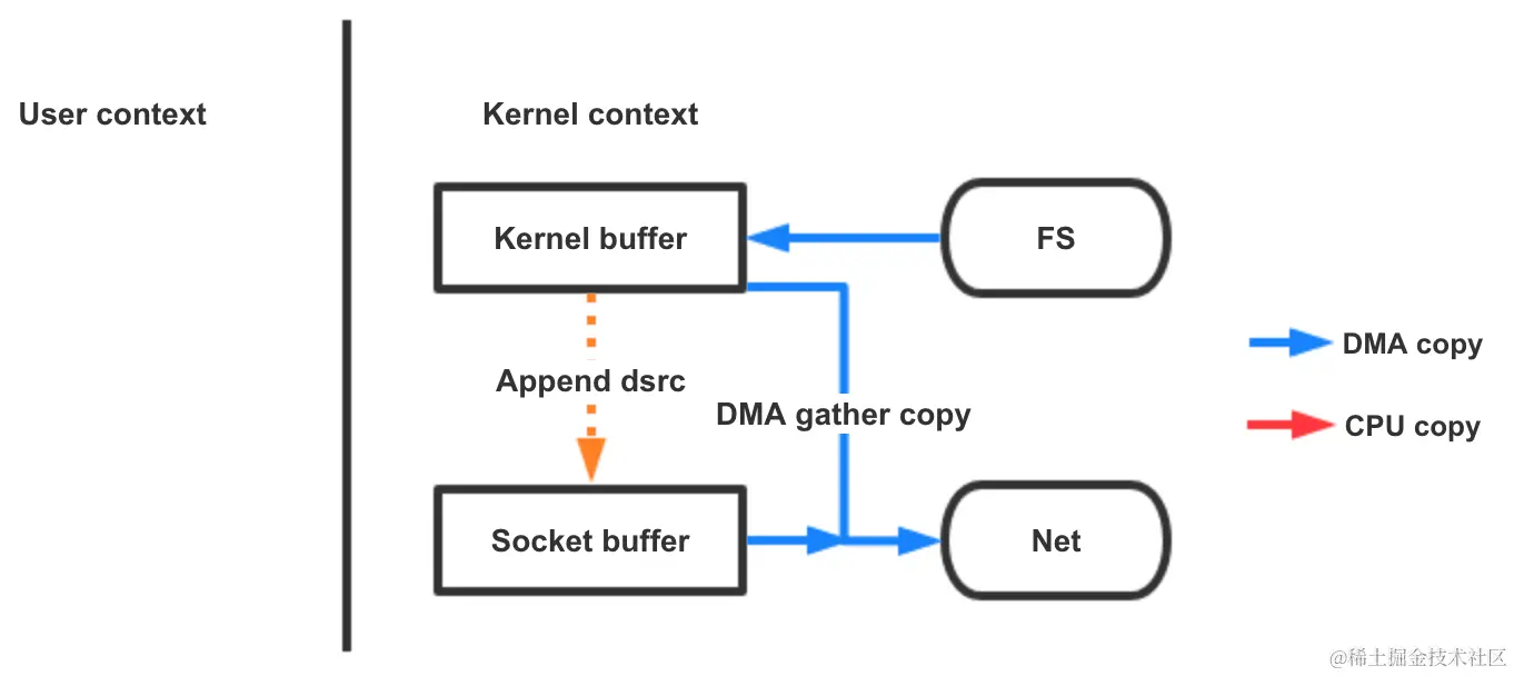 聊到这里,sendfile至少还需要一次cpu copy,那么这一步能不能省去呢?为了消除内核完成的所有数据复制,我们需要一个支持收集(gather)操作的网络接口。同时,在内核版本2.4中,也修改了套接字缓冲区描述符以适应零拷贝要求。 这种方法不仅减少了多个上下文切换,还完全取消了cpu copy。