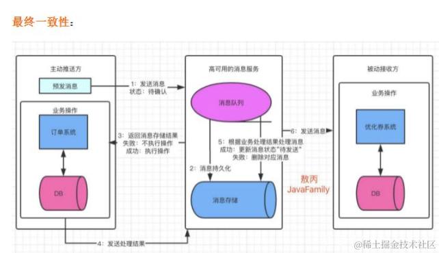 只要业务主动方本地事务执行成功,那么消息服务一定会投递消息给下游的业务被动方,并最终保证业务被动方一定能成功消费该消息(消费成功或失败,即最终一定会有一个最终态)。