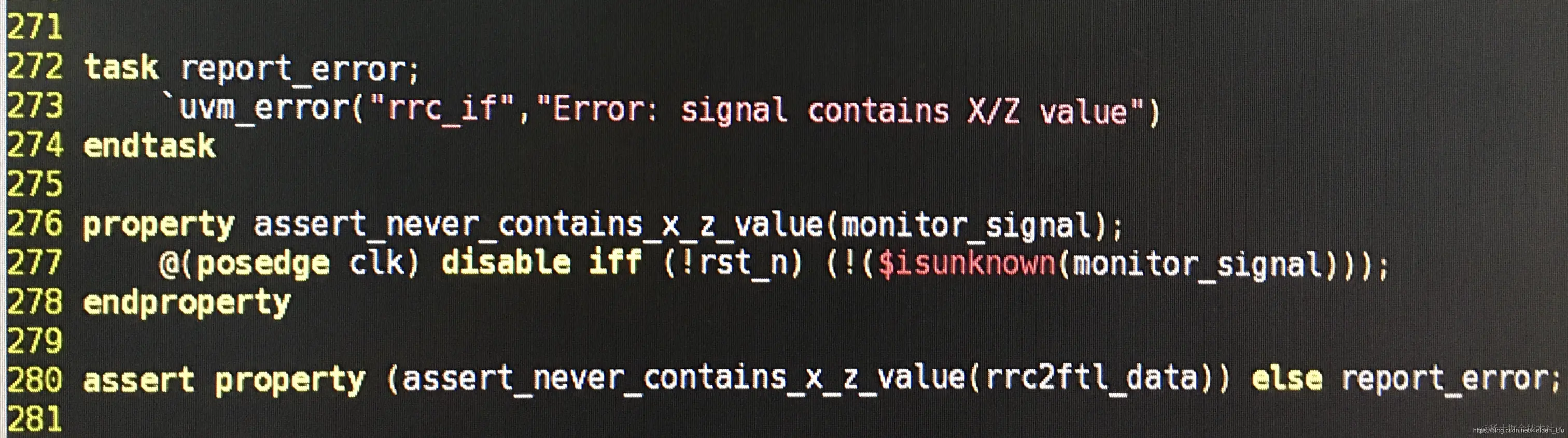 参考uvm源码example用法: always @(negedge clock) #可以将等待时钟沿放在最外面,减少书写 begin #可以直接assert property,省略 property endproperty书写 assertAddrUnknown:assert property( disable iff(!has_checks) ($onehot(sig_grant) |-> !isunknown(sig_addr))) else $error(" ...."); assertResetFor3Clocks:assert property( disable iff(!has_checks) ($rose(sig_reset) |-> sig_reset[*2])) else $error(.....); end - 判断信号中的 X/Z:
