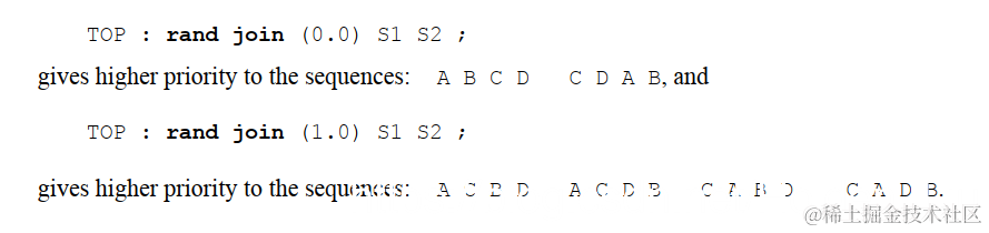 rand join:交叉产生序列,S1 和 S2两个序列,上图可能产生6种结果,可能先产生S1序列,也可能先产生S2序列,但是S1序列中的 A B 有先后顺序,S2序列中的 C D 有先后顺序。