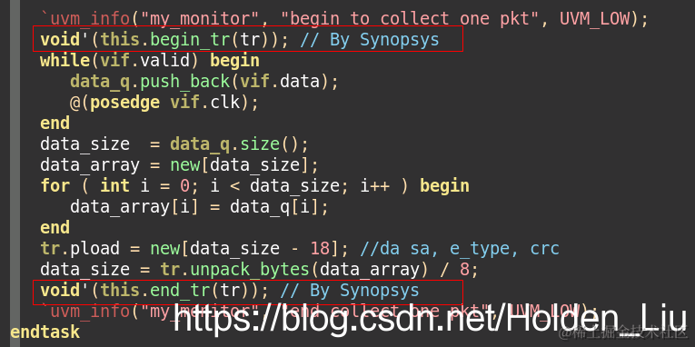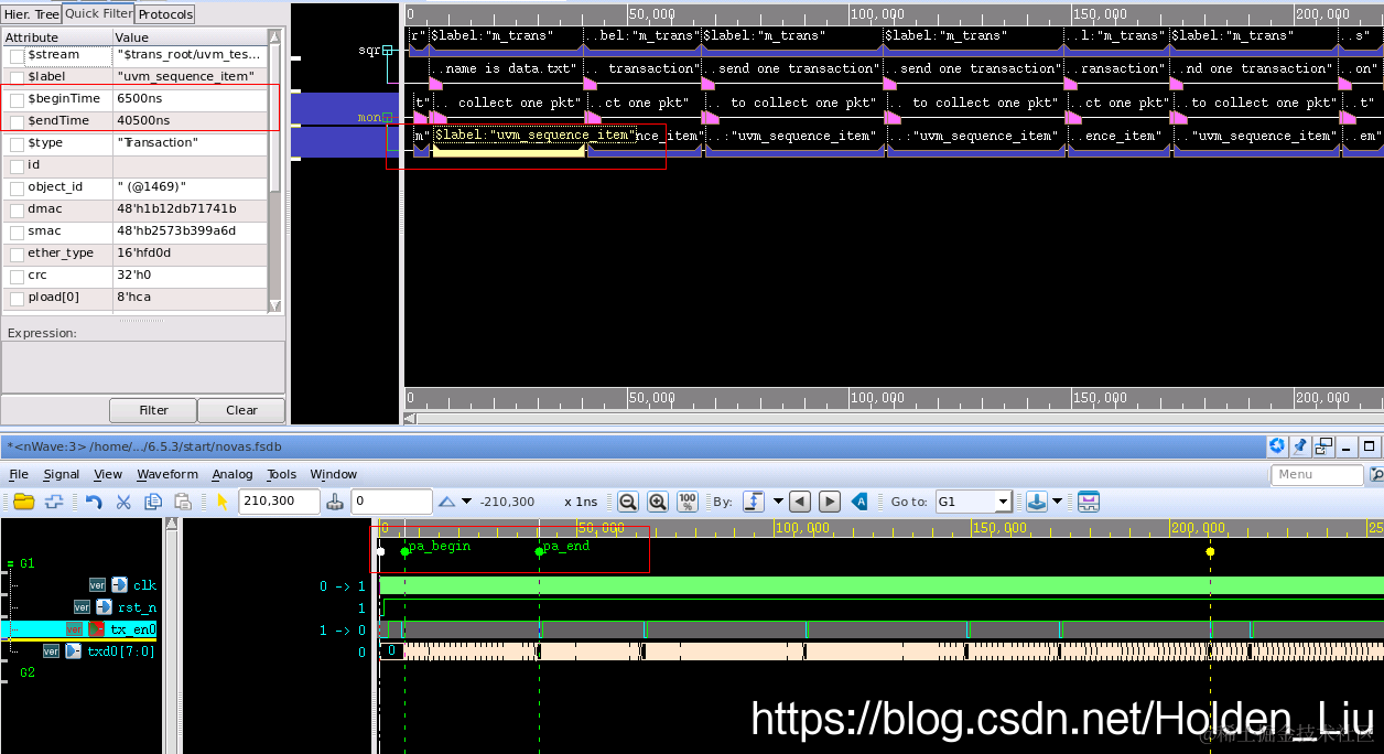 Verdi 默认只将sequencer中的Transaction dump到FSDB文件中,如需在non-sequencer,如monitor中dump Transaction,需加上如下两行代码,且成对存在。除此之外,还有SNPS VIP,SystemVerilog API其他方式。