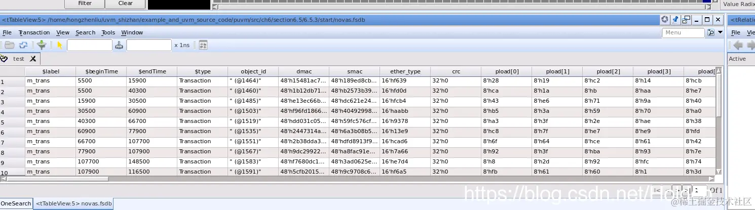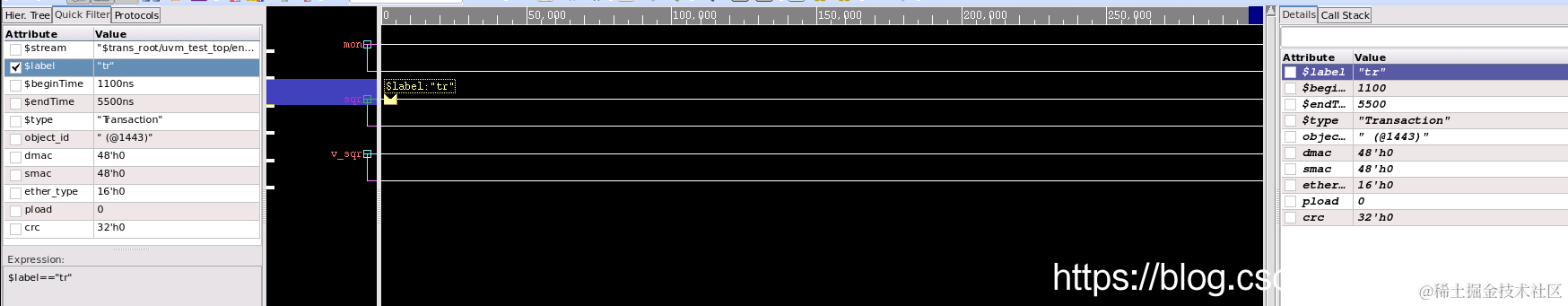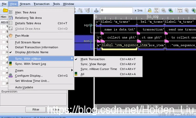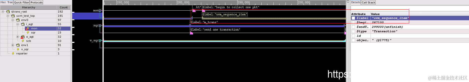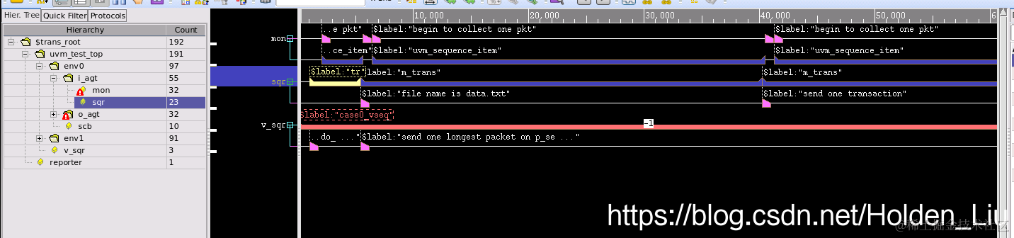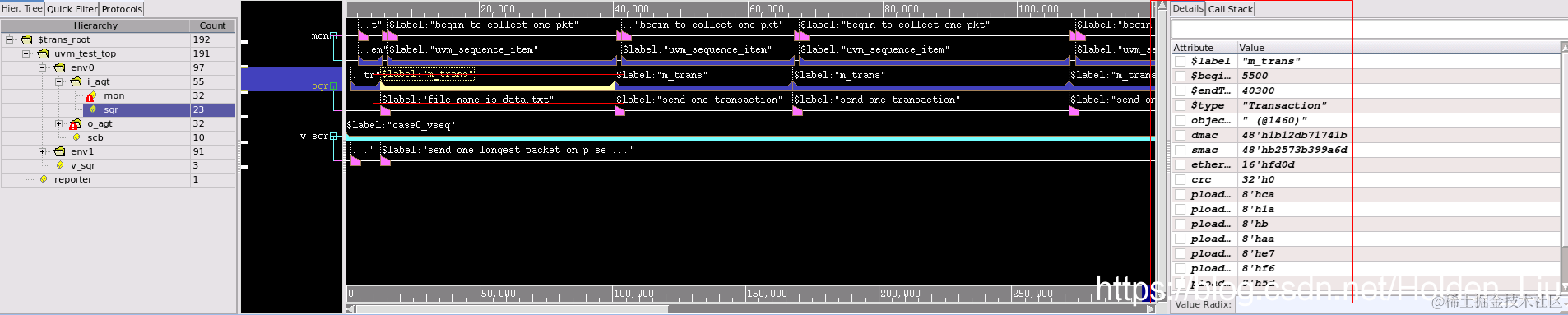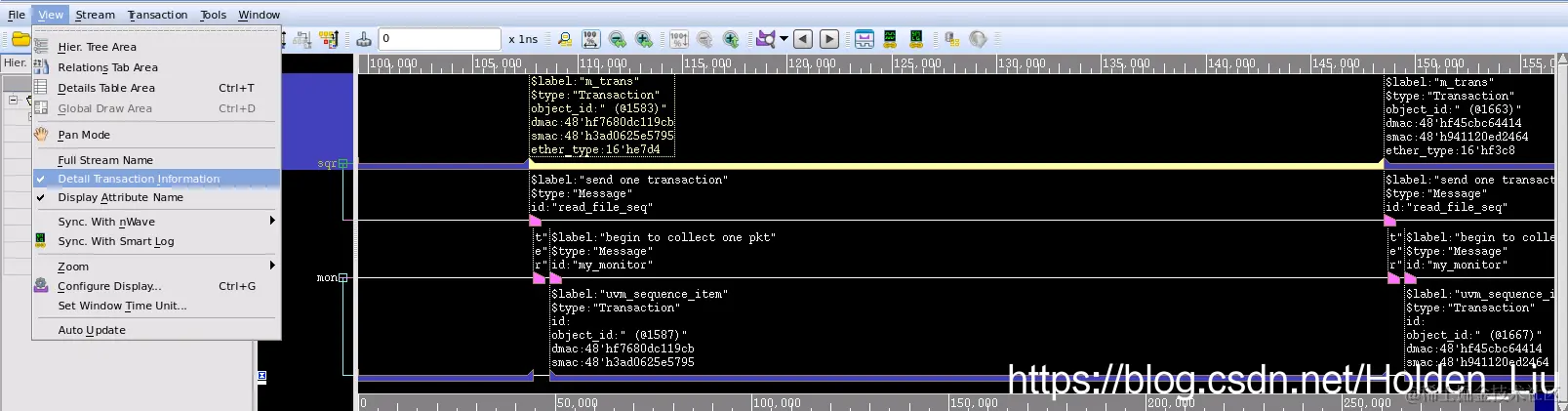 2.sqr第一个tr, 是在vseq中创建的,所以选中后,v_sqr的stream变红,其为parent关系。(可在tr上右键->Highlight Relation)