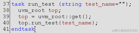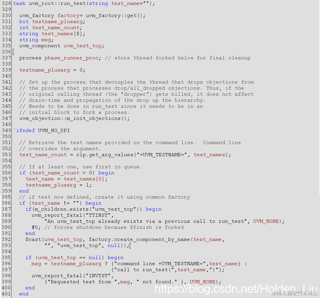 位于uvm_globals.svh中的run_test()函数通过uvm_root::get()创建(这里应该是uvm_root::get()第一次被调用,所以说是创建了uvm_root的实列,其他地方调用是reuturn返回的实例,都是在此处创建的)唯一的uvm_root。然后调用uvm_root中的run_test()函数,代码如下图: