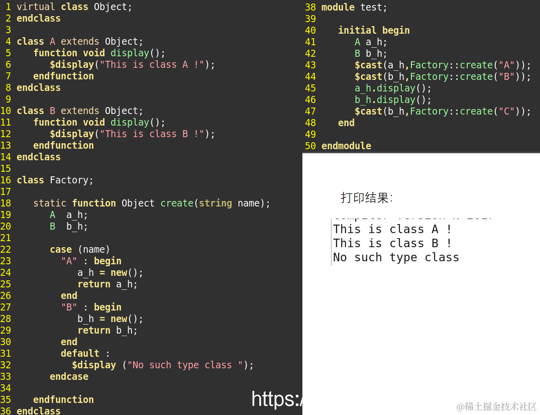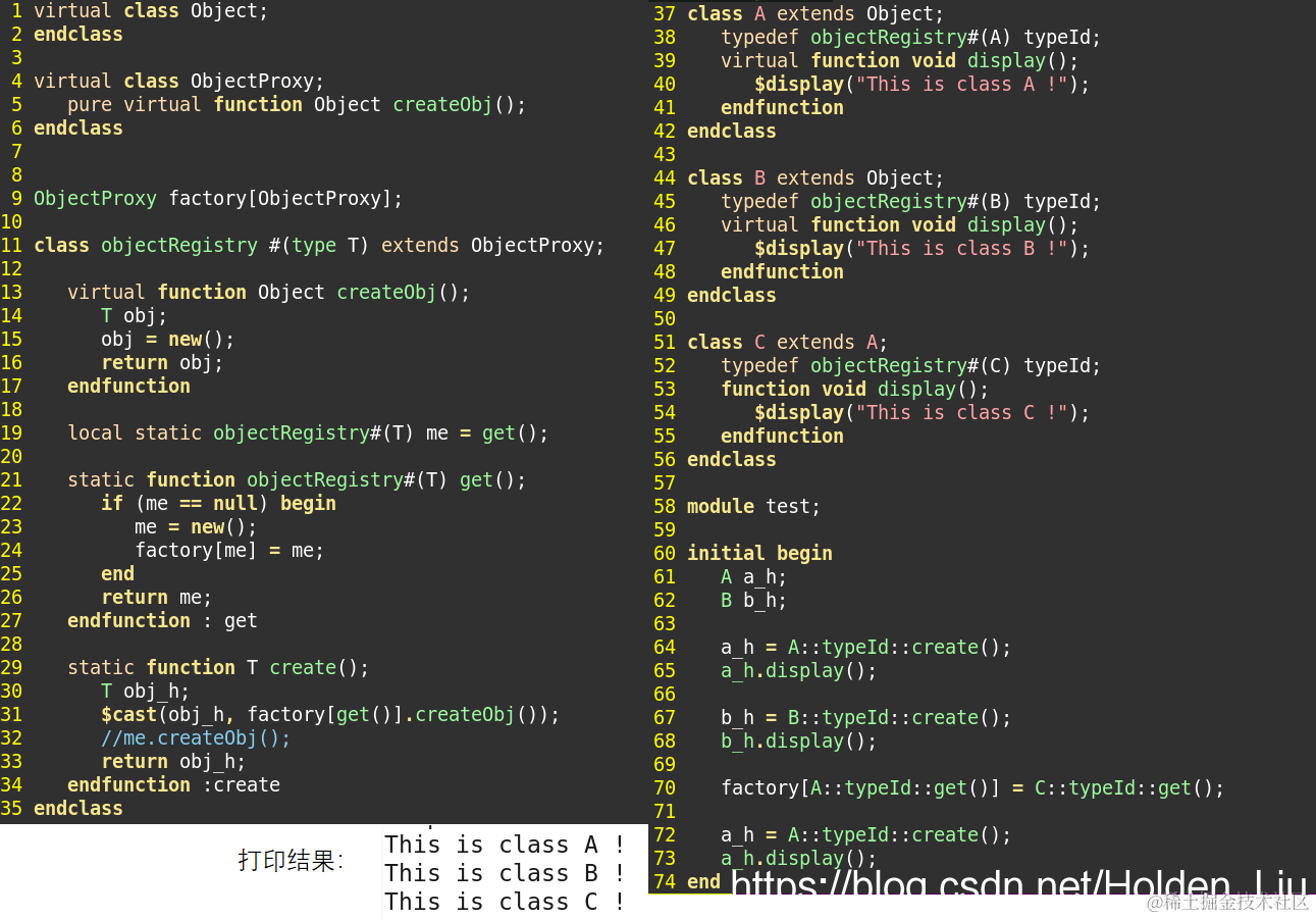 line38, 45:在构建class A , class B 时,通过typdef objectRegistry#(type T) typeId 实现 类的注册,UVM中通过`uvm_object/component_utuils宏来完成,实现更复杂。