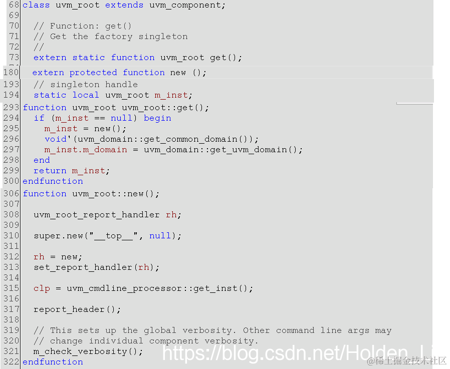 uvm_root源码如下,使用单例模式,代码结构和上述示例相同,构造函数new()使用protected修饰,和local一样,无法被外部调用。