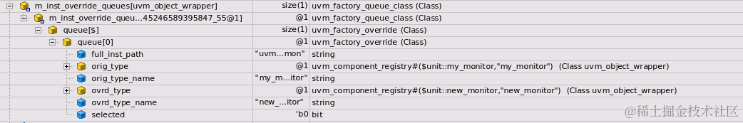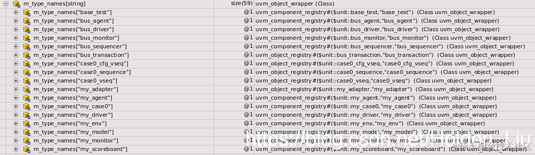 通过trace m_children变量可以看到,uvm_root中m_children存放着my_case0的实例,uvm_test_top中例化了env和v_sqr,env下除了agt,scb,像TLM这些,也属于uvm_component,也被加入到了m_children中。(为什么 TLM 也被当作 component 加入,见🔗UVM设计模式 (七) 观察者模式、uvm_subscriber、TLM、总结)