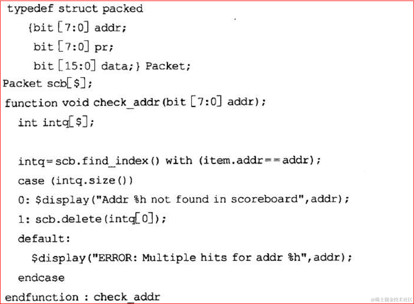 如果规则是Packet不是保序的,但是addr保持不变,则可以通过SV内建方法 find_index() with (item.addr == addr) 在容器中筛选出待比较的Packet。find_index() with (expression) 中内建了迭代器,根据所给的expression条件“吐出”符合的元素。