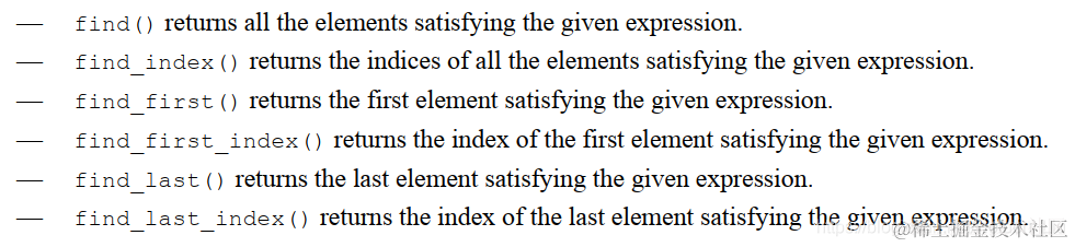 如果没有在方法中声明迭代器参数(iterator argument), 则使用默认值 item。item是数组中依次被迭代器遍历的元素。如果指明了参数,则 with(expression)中应该使用指明的参数,如 q = A.find_index(x)with ( x > 3); with中的relational operators (<, >, ==) 返回的是布尔值(0,1)。