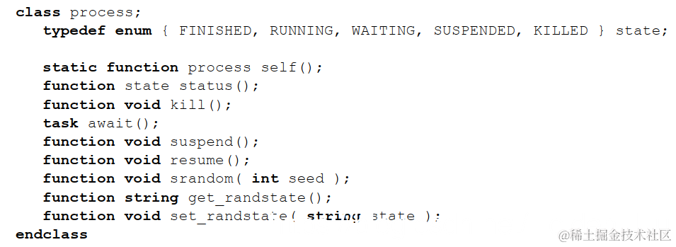 SV中的fork相关函数可以创建新的进程,但是对于进程的管理, 只有 wait fork, disable identifier, disable fork这些。其他语言中一般都有专门管理进程的操作方法,比如python中的🔗multiprocessing模块。所以SV中加入了一个class process,提供了更精细的进程管理。class process并不可以用于创建进程,只可以在initial begin ..end,always,fork等创建进程的语句中通过 process::self() 获取该进程;status() 获得进程状态,kill() 终止进程及子进程,suspend() 挂起进程,resume() 恢复进程,srandom(int seed) 设置进程的随机种子。