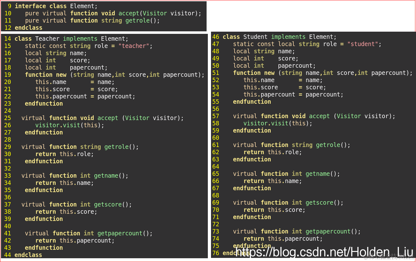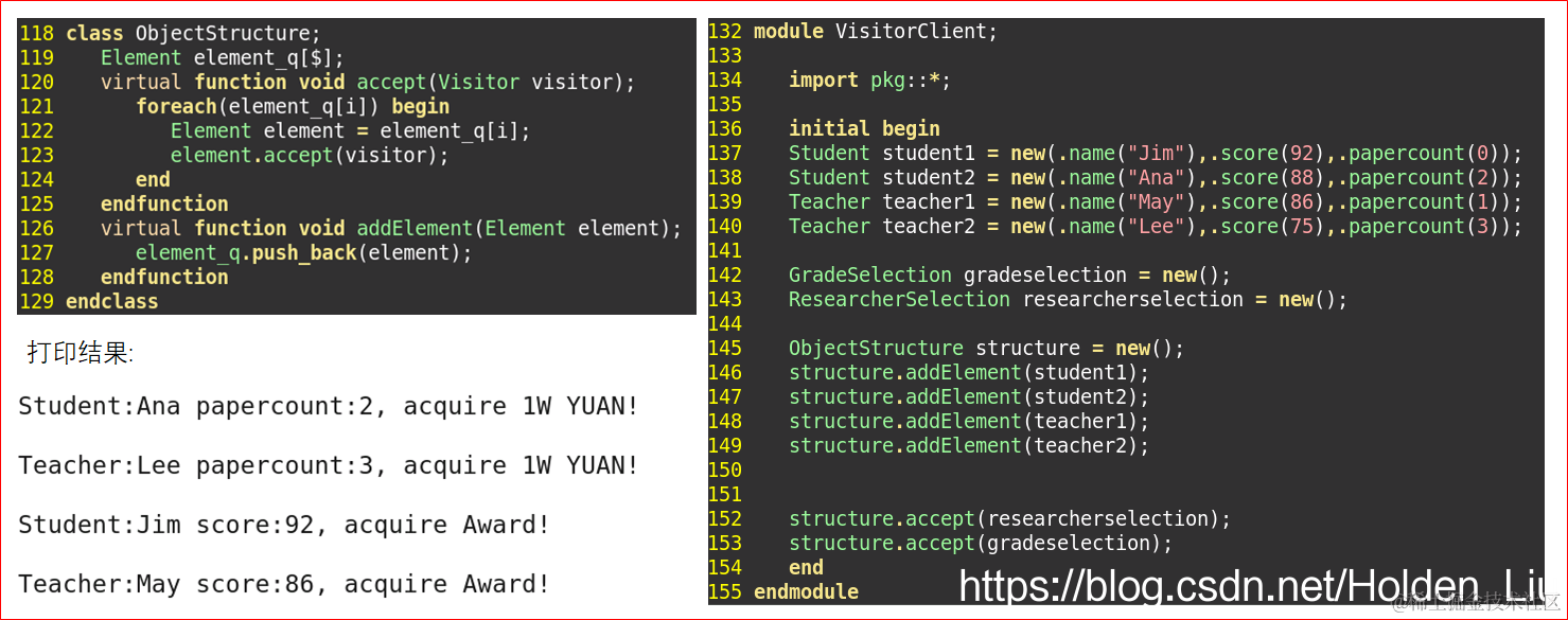 - class Teacher class Studnet中调用 visitor.visit(),不需要特别指明哪一种操作。