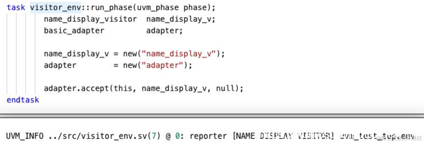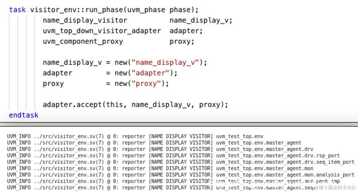 env中创建visitor, adapter的实例,accept传入的是env这个comonent,打印处uvm_test_top.env