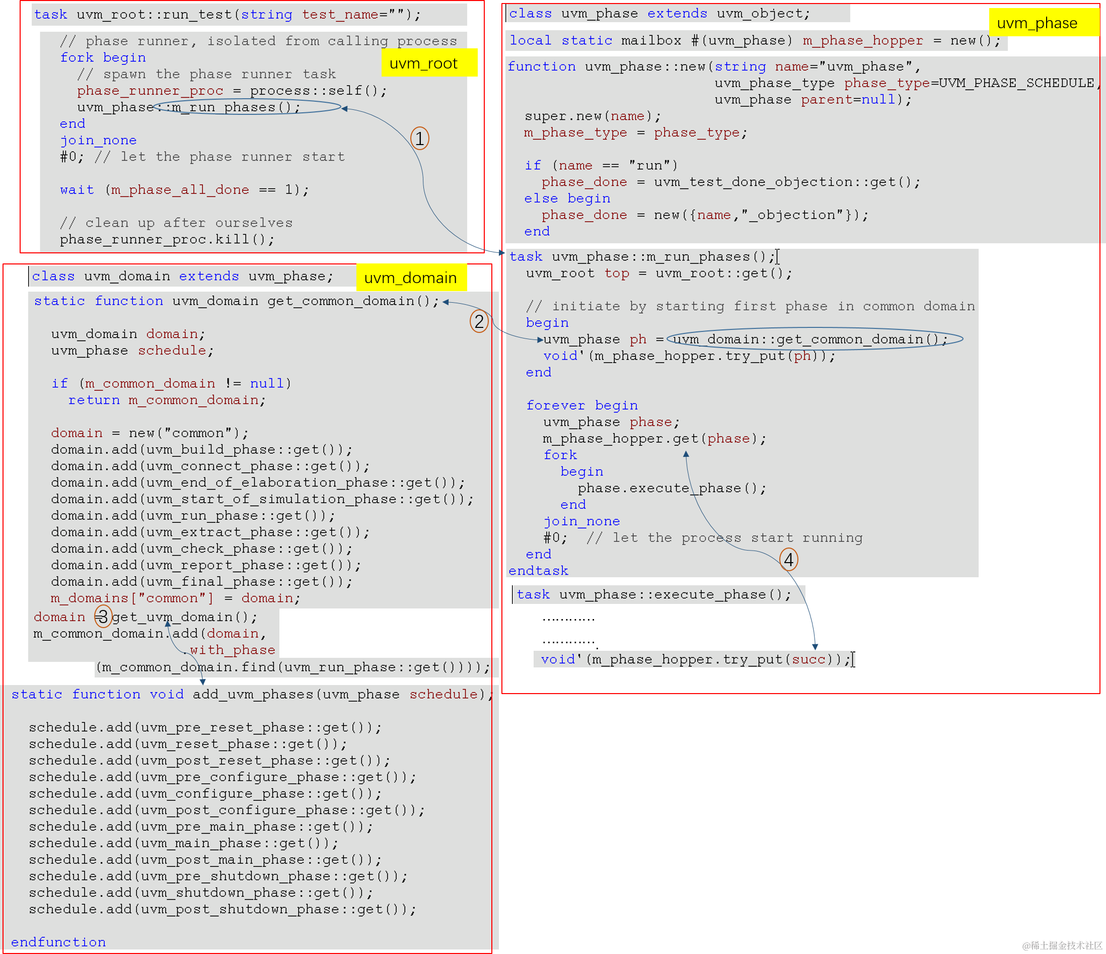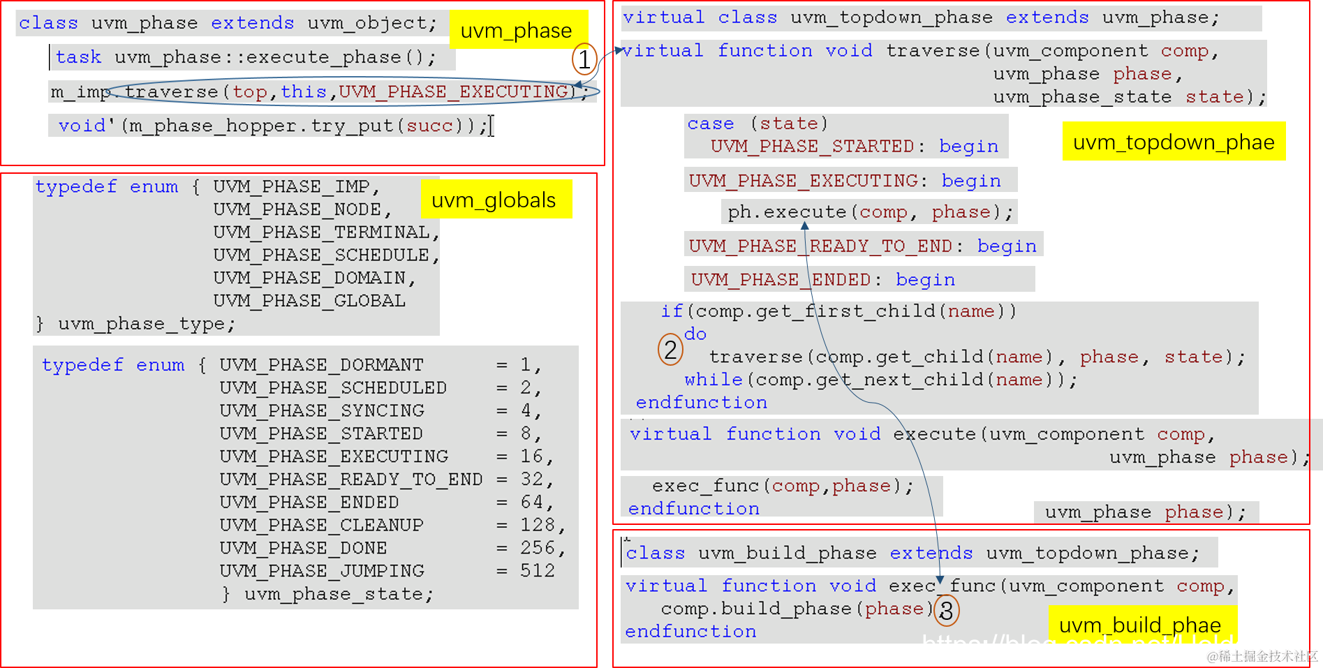 接上面,phase.execute_phase() 的具体实现会根据不同的uvm_phase_type和uvm_phase_state走不同的分支。代码细节解析参考🔗《UVM1.1 应用指南及源码分析》