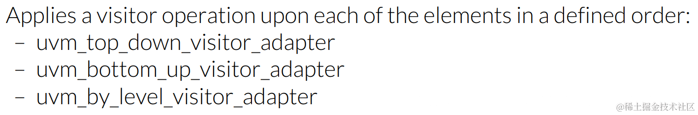 uvm_visitor_adapter: 提供了accept函数,用于实现visitor和component的连接,并对每个component调用visti方法。