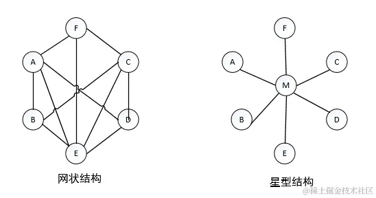 如果不使用中介者模式,各个系统模块,或者说各个类之间,互相依赖,就会形成一个复杂的网装结构;使用了中介者模式,系统就变成了结构清晰的星形结构。