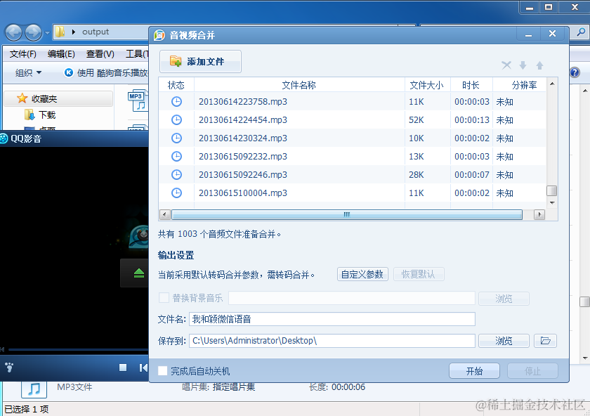 然后的然后,就是找语音文件合并的工具了,小弟找到是QQ影音,工具里的音视频合并。很好用。如图。