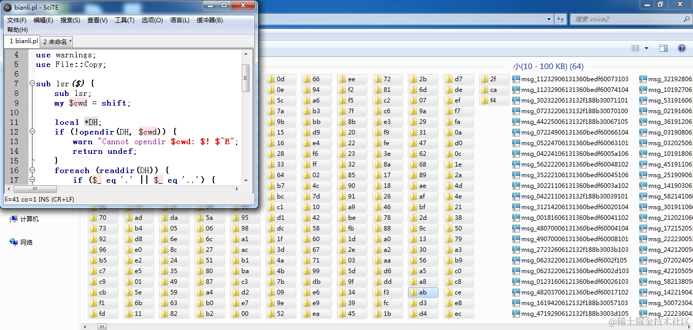 小弟,最近迷恋上了微信,与女友聊天基本都是微信,但是一条一条信息听起来太麻烦,小弟就设想能否将信息一条一条按照顺序,合并起来。但是不得不吐槽的是微信的语音存放文件夹太恶心了,名字毫无顺序,每个文件夹下还有子文件夹。有了思路,那就行动吧,首先从微信散乱的文件夹下,提取出AMR语音信息文件,并按修改时间重命名。这些工作当然用小弟熟悉的perl语言完成了,虽然小弟不甚熟练,但是基本操作还能胜任。贴出,脚本。
