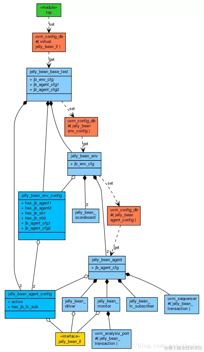 这篇文章将解释UVM配置对象,因为之前的文章并没有太多的介绍。 jelly-bean验证平台使用jelly_bean_agent_config和jelly_bean_env_config两种配置对象。 前者配置jelly_bean_agent,后者配置jelly_bean_env。 下图显示了验证平台和配置相关类的类图。