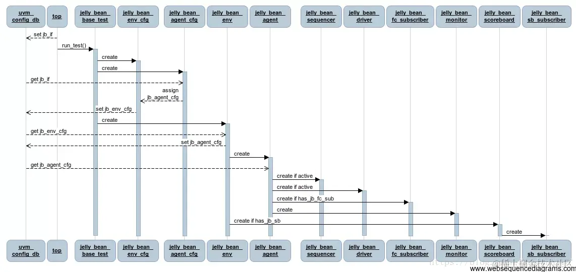 顶级Verilog模块实例化两个jelly_bean_ifs(第6行和第7行)并将它们存储在配置数据库中(第17行至第20行)。 cntxt和inst_name提供正在存储的虚拟接口的范围信息。由于顶层模块不是uvm_component,所以null被用作cntxt。 uvm_test_top是由uvm_root类的run_test()任务实例化的顶层uvm_component的名称。