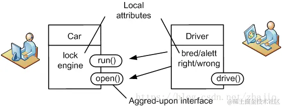 OOP面临的挑战之一是定义对象和它们之间的交互。最初的协议是让个人和团队合作的关键。这些对象通过商定的公共接口(合同)提供服务。其他对象可以使用这个公共API。对象内部实现可以独立开发和完善。语言提供信息隐藏设施,以限制对象使用公共方法。下图演示了两个在OOP环境中工作的开发人员,使用单独对象之间的协议接口。