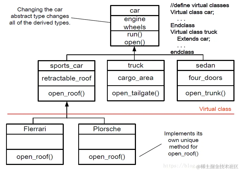 程序可能需要以程序的方式操纵一组对象。例如,您可能想要一个汽车的抽象句柄,并在一个循环中调用数组中所有汽车的run()方法。每个汽车类都有不同的run()方法实现。对抽象类执行run()并执行特定run()的能力称为“多态性”。程序员不必提前知道对象的确切类型。下面的例子3-2演示了Plorsche和Flerrari汽车是如何从一个抽象运动车类派生的。多态性允许程序的print()任务持有一个指向可能包含Plorsche和Flerrari汽车的虚拟类数组的指针,但为每个项目执行正确的print()函数\