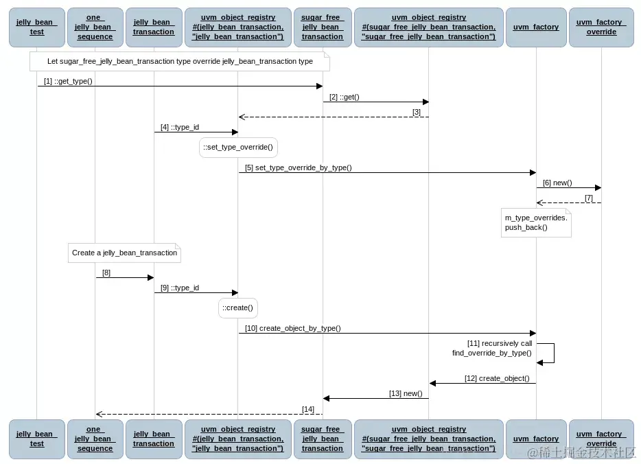 - uvm_factory调用find_override_by_type()来检查jelly_bean_transaction类型是否被另一个类覆盖(步骤4)
