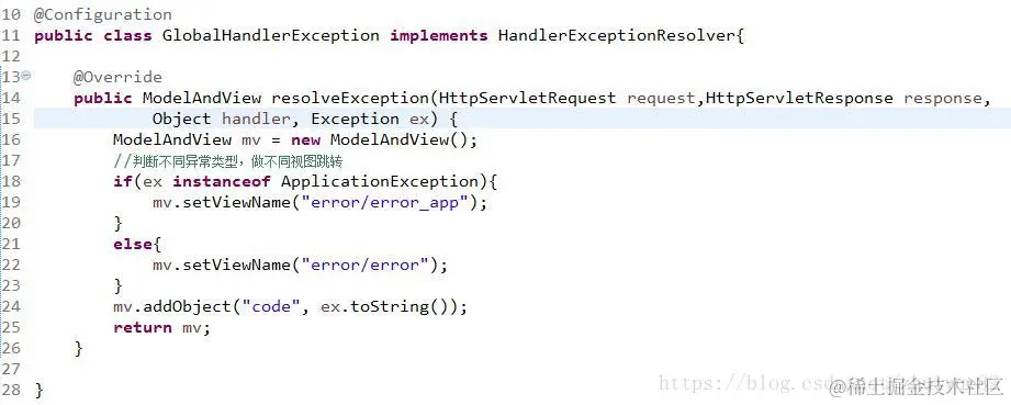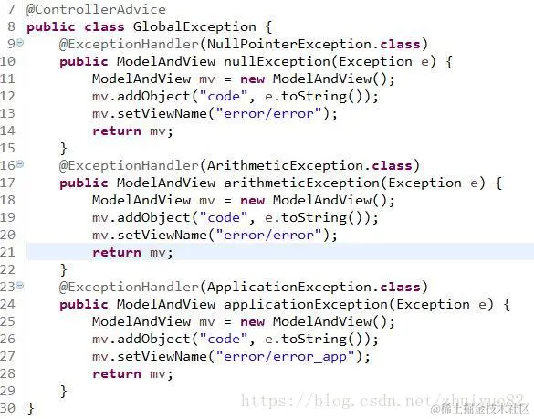 此方法返回一个ModelAndView ,即此方法返回的是一个页面路径,出现此异常时,跳转到相应的异常显示页面。