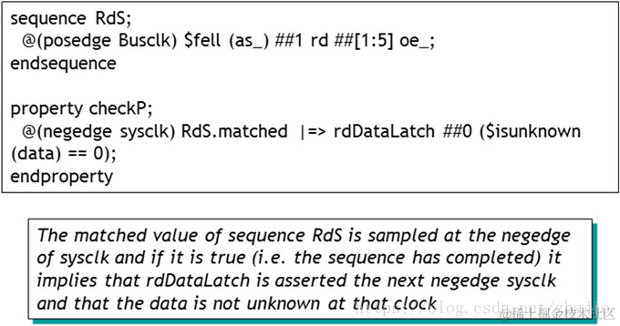 在图11.7中,序列'RdS'使用Busclk,而属性checkP使用sysclk。 @(negedge sysclk)RdS.matched意味着在sysclk的下降沿,序列RdS(从Busclk运行)必须结束。'RdS'可能比nedgege sysclk稍早完成(即,当Busclk的前一个posedge将到达时)。这没关系,因为我们正在从Busclk转换到sysclk(只要序列RdS在前一个posedge Busclk完成)。
