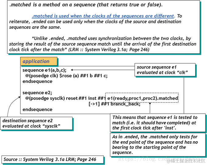 由于时钟可能不同,对匹配的理解会变得有点复杂。但它遵循与多时钟属性相同的规则。如图11.4所示,序列'e1'使用'clk'作为时钟,而序列'e2'使用'sysclk'作为时钟。序列'e2'表示'reset'后; 1个时钟后; 'inst'必须为真,并且在1个时钟后,序列'e1'必须至少匹配一次(即结束),再过1个时钟后,branch_back必须为真。这是一个非常有趣的方式,在一个序列中插入一个.matched(或 .ended)。序列'e1'自己运行。我们真正关心的是它在我们所期望的情况下匹配(结束)。让我们看看一些将使这个概念清晰的例子。