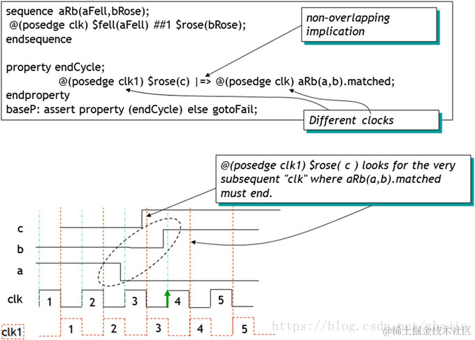 图11.5显示在'c'的上升沿我们想看到aRb序列匹配。让我们看看时序图。当$ rose(c)在clk1(clk1 = 3)的posedge处为真时,它查找序列'aRb'的结尾。序列'aRb'在clk= 3期间开始并且在clk = 4时结束。请注意,'aRb'的结束(即$ rose(bRose)的匹配)正好在clk1边缘之后的下一个'clk'边缘。这就是属性要求的"@(posedge clk1) $rose(c)|=>@(posedgeclk) aRb(a,b).matched;"