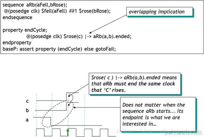 你必须非常仔细地理解这一点,就像看起来那么简单。非重叠蕴涵运算符指出,当$ rose(c)是真的,在下一个时钟时,序列aRb必须结束。因此,如图所示,属性$ rose(c)成立一个时钟后寻找aRb的结束。这很直观,但很容易误解。