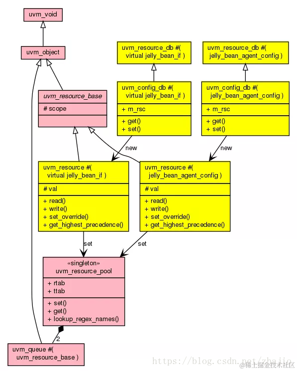 这篇文章将解释配置数据库(uvm_config_db)是如何工作的。 在配置类中,我们使用uvm_config_db来存储jelly_bean_if,jelly_bean_env_config和两个jelly_bean_agent_configs。 这篇文章将分析配置数据如何存储和检索。 下面显示了与配置数据库相关的类图。 请注意,为了避免混乱,我们只显示了与jelly_bean_if和jelly_bean_agent_config相关的类。 UVM标准库类以粉色显示,而专用于jelly_bean_transaction类型的UVM类以黄色显示。