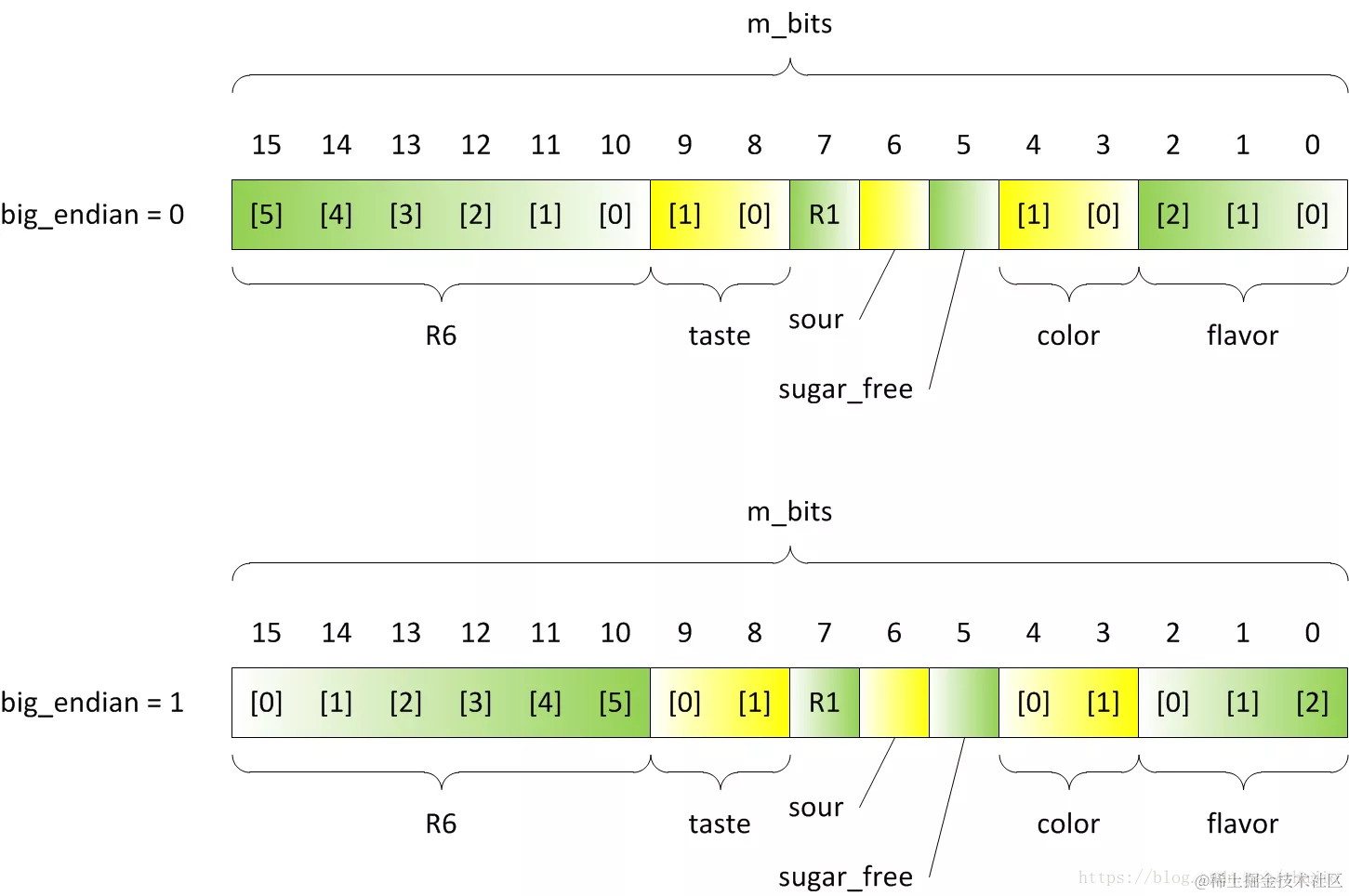 您可能已经注意到我们在第22行创建了一个uvm_packer对象(jb_packer),并将它的big_endian属性设置为0(第23行)。我们在打包和解压jelly_bean_transaction(第24行和第25行)时使用了此打包器。这是为了确保我们将每个属性值打包成小端数,正如我们在寄存器抽象中所做的那样。如果您只想打包并解压缩并且不关心比特流表示,则不必创建uvm_packer对象。如果未指定uvm_packer,则将使用全局uvm_default_packer策略,其中big_endian的值为1.下图显示big_endian的值如何影响比特流表示形式。 m_bits是uvm_packer的一个属性,它以位数组( bit array)的形式表示打包比特流。