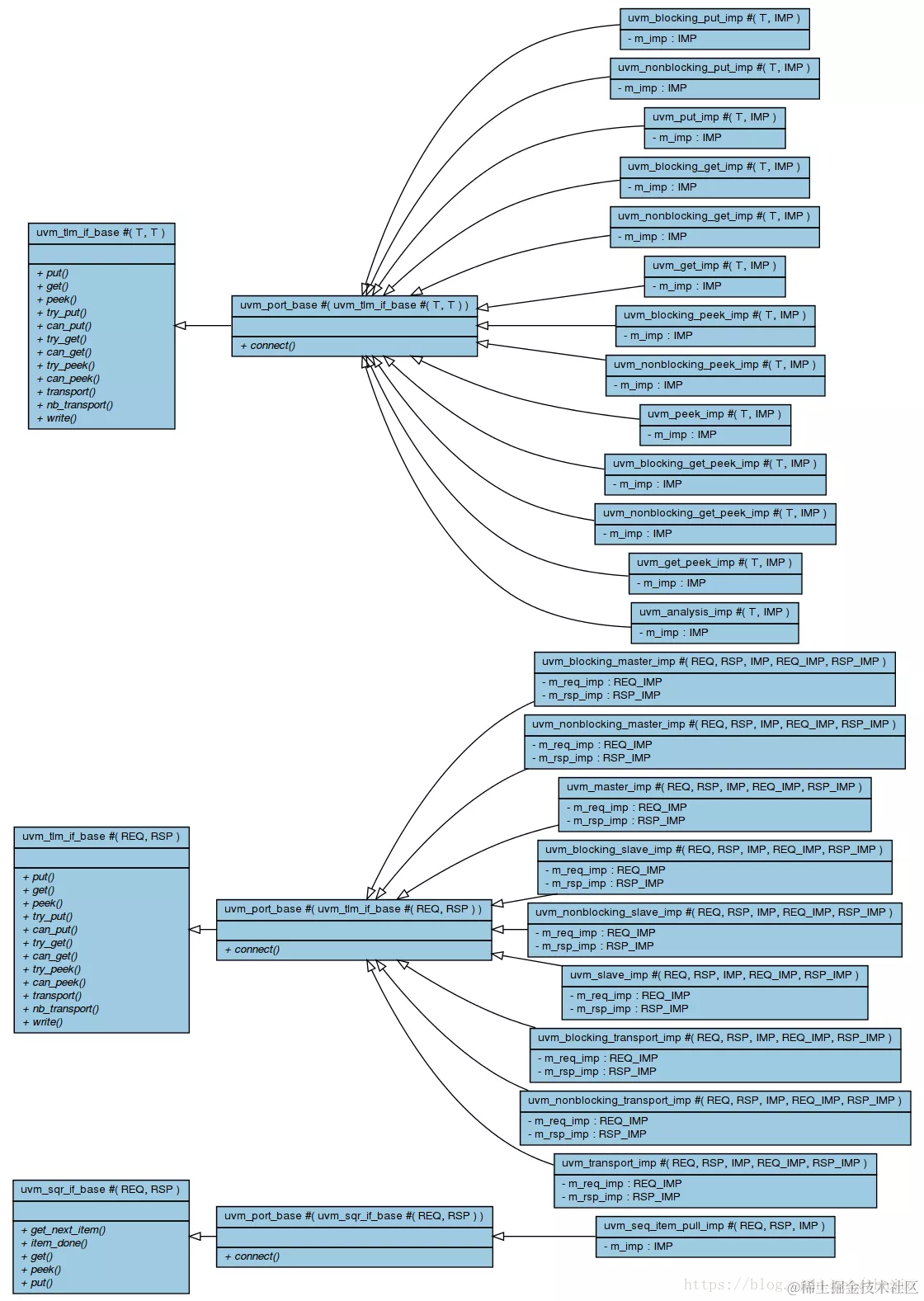 Imps提供访问方法的实现。准确地说,imp将实现委托给实际实现访问方法的组件。当imp被实例化时,组件的类型作为参数传递。与端口和导出类似,每个imp都是uvm_port_base类的子类,而uvm_port_base类又是uvm_tlm_if_base类的子类(或uvm_sqr_if_base类的子类(如果是uvm_seq_item_pull_imp))。请参阅下面的类图。