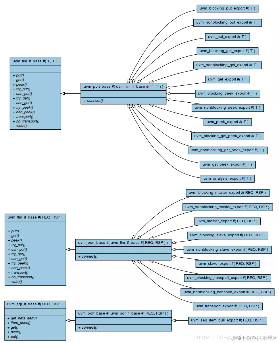 当您向父组件提升imp(请参阅下一部分)时使用导出。与端口类似,每个导出都是uvm_port_base类的一个子类,而uvm_port_base类又是uvm_tlm_if_base类的子类(或uvm_sqr_if_base类的子类(如果是uvm_seq_item_pull_export)。请参阅下面的类图。