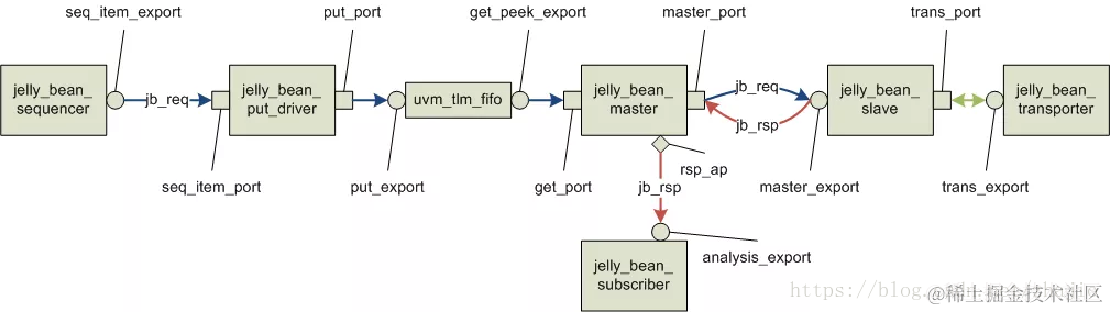 jelly_bean_master有一个uvm_get_port(get_port,第4行),一个uvm_master_port(master_port,第5和6行)和一个uvm_analysis_port(rsp_ap,第7行)。 在run_phase中从get_port(第25行)获得一个jb_req,然后将其放到master_port(第27行)。 jelly_bean_master等待jelly bean响应(jb_rsp,第29行),然后将其写入rsp_ap(第31行)。