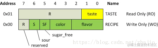我们使用与寄存器抽象中定义的相同的DUT(jelly_bean_taster)。 被测设备有两个寄存器,如下所示。